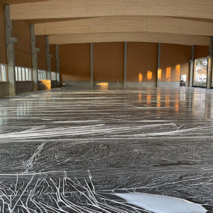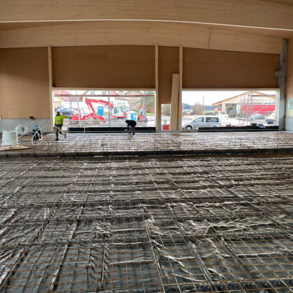 Im weiteren Verlauf des Baus wurde der Innenraum gestaltet, wobei besonderes Augenmerk auf den Boden gelegt wurde. Hier kam es zur Verlegung von Gittern und dem Auftragen des Estrichs, um eine ebene und robuste Oberfläche zu schaffen. Der Dachaufbau parallell hierzu sicherte das Gebäude gegen Witterungseinflüsse ab.