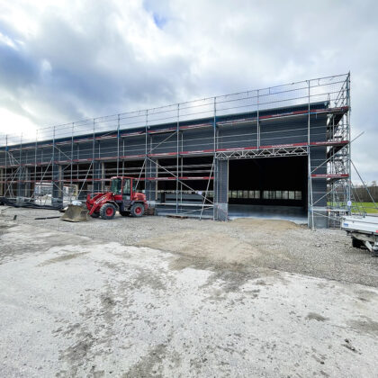 Mit dem nahezu vollendeten Äußeren der Halle und dem finalen Entfernen der Gerüste steht die Fertigstellung unmittelbar bevor. Wir freuen uns darauf, die Halle in Betrieb zu nehmen und damit unsere Fähigkeiten in der effizienten Materialverwaltung und schnellen Produktionsweise weiter zu verbessern.